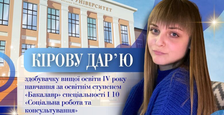 Колектив Незламного МДПУ імені Богдана Хмельницького щиро вітає здобувачку вищої освіти IV року навчання за освітнім ступенем «Бакалавр», спеціальності I 10 «Соціальна робота та консультування» – КІРОВУ ДАР’Ю