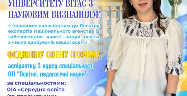 🏛️💫 Колектив МДПУ імені Богдана Хмельницького щиро вітає Федюніну Олену Ігорівну, аспірантку 3 курсу спеціальності 011 «Освітні, педагогічні науки», з почесним включенням до Реєстру експертів з числа здобувачів вищої освіти Національного агентства із забезпечення якості вищої освіти за спеціальностями: