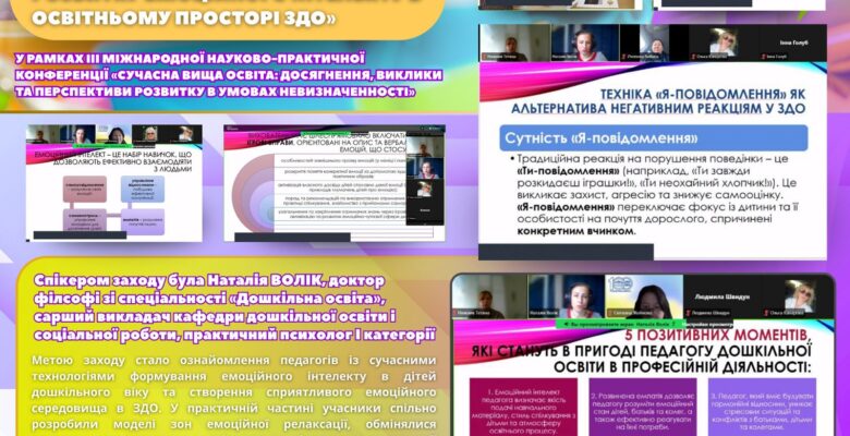 У рамках ІІІ Міжнародної науково-практичної конференції «Сучасна вища освіта: досягнення, виклики та перспективи розвитку в умовах невизначенності» на базі Мелітопольського державного педагогічного університету імені Богдана Хмельницького 11 жовтня на кафедри дошкільної та соціальної роботи відбувся майстер-клас «Емоційний дизайн: інструменти розвитку емоційного інтелекту в освітньому просторі закладу дошкільної освіти», який провела доктор філософії зі спеціальності «Дошкільна освіта», старший викладач кафедри дошкільної освіти і соціальної роботи, практичний психолог І категорії Наталія ВОЛІК