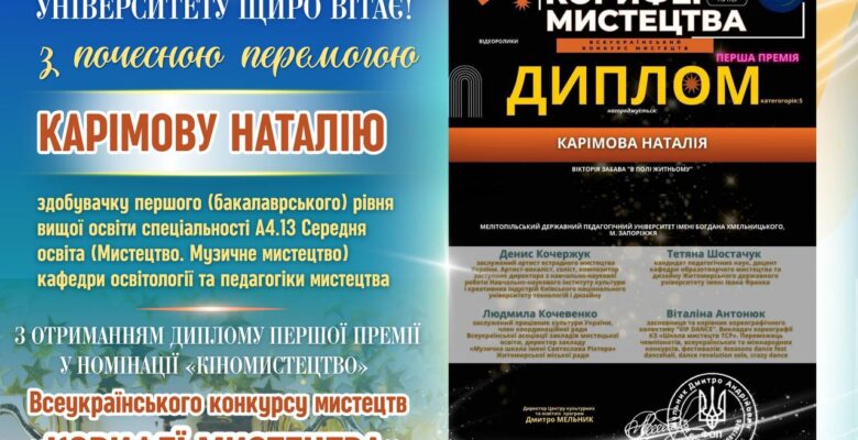 ⭐️🎉 Колектив МДПУ імені Богдана Хмельницького щиро вітає Каримову Наталію — здобувачку першого (бакалаврського) рівня вищої освіти спеціальності А4.13 Середня освіта (Мистецтво. Музичне мистецтво) кафедри освітології та педагогіки мистецтва — з яскравим творчим успіхом!