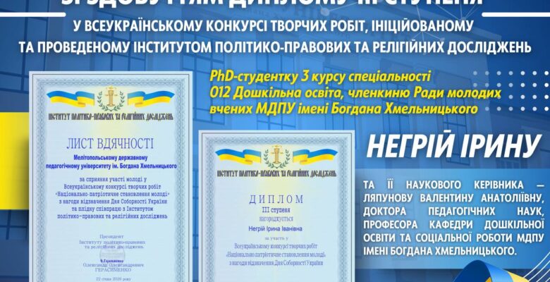 🏛️🥳 Колектив Мелітопольського державного педагогічного університету імені Богдана Хмельницького щиро вітає Негрій Ірину, PhD-студентку 3 курсу спеціальності 012 Дошкільна освіта, членкиню Ради молодих учених МДПУ імені Богдана Хмельницького, зі здобуттям диплома ІІІ ступеня у Всеукраїнському конкурсі творчих робіт, ініційованому та проведеному Інститутом політико-правових та релігійних досліджень за підтримки Міністерства молоді та спорту України, Міністерства освіти і науки України, Національного агентства із забезпечення якості вищої освіти, НАПН України, Європейської культурної асамблеї, Інституту модернізації змісту освіти МОН України, Інституту проблем виховання НАПН України, КМДА, громадських організацій та інших поважних інституцій.