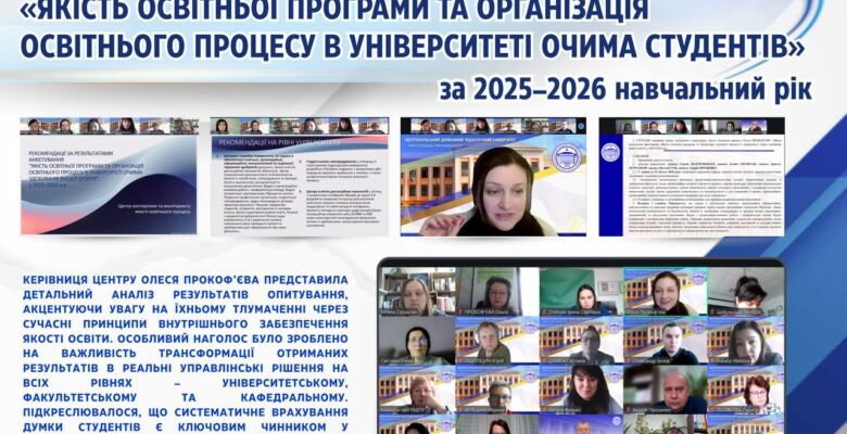 📅 2 лютого 2026 року у межах розширеного засідання ректорату МДПУ імені Богдана Хмельницького Центр експертизи і моніторингу якості освітнього процесу представив результати анкетування здобувачів вищої освіти «Якість освітньої програми та організація освітнього процесу в університеті очима студентів» за 2025–2026 навчальний рік.