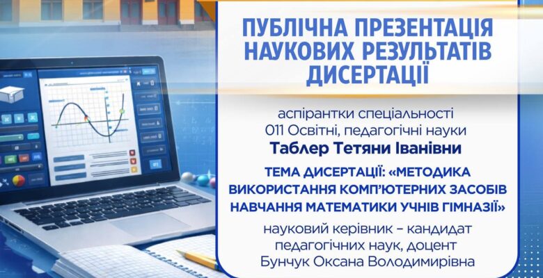 📝 Тема дисертації: «МЕТОДИКА ВИКОРИСТАННЯ КОМП’ЮТЕРНИХ ЗАСОБІВ НАВЧАННЯ МАТЕМАТИКИ УЧНІВ ГІМНАЗІЇ» (науковий керівник — кандидат педагогічних наук, доцент Бунчук Оксана Володимирівна).