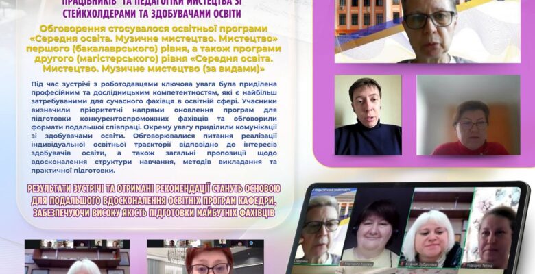 🤝 17 березня 2026 року відбулась зустріч гарантів освітніх програм та науково-педагогічних працівників кафедри освітології та педагогіки мистецтва зі стейкхолдерами та здобувачами освіти. Обговорення стосувалося освітньої програми «Середня освіта. Музичне мистецтво. Мистецтво» першого (бакалаврського) рівня, а також програми другого (магістерського) рівня «Середня освіта. Мистецтво. Музичне мистецтво (за видами)».