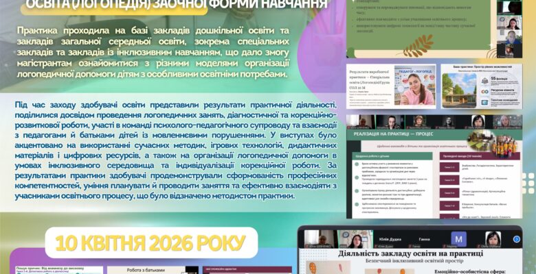 📅 10 квітня 2026 року відбулася звітна конференція за результатами проходження виробничої практики здобувачів другого (магістерського) рівня вищої освіти спеціальності А6.01 Спеціальна освіта (Логопедія) заочної форми навчання групи Сол25М.