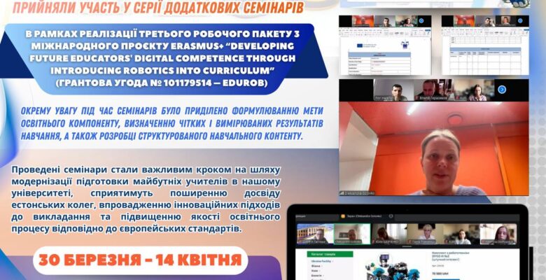 🌍 В рамках реалізації Міжнародного проєкту ERASMUS+ “Developing Future Educators’ Digital Competence Through Introducing Robotics into Curriculum” (Грантова угода № 101179514 – EduRob), а саме третього робочого пакету 3, який присвячений розробці освітнього компоненту з робототехніки для здобувачів вищої освіти в галузях дошкільної, початкової, середньої освіти, а також технічних спеціальностей, викладачі МДПУ імені Богдана Хмельницького прийняли участь у серії додаткових семінарів. Організаторами семінарів виступили фахівці Тартуського університету (м. Тарту, Естонія). Заходи тривали з 30 березня по 14 квітня 2026 року та були проведені окремо для представників груп розробників освітніх компонентів, що сприяло дотриманню фокусу уваги саме на специфіці певної галузі.