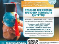🗓 10 лютого 2026 року о 14:20 відбудеться публічна презентація наукових результатів дисертації аспіранта спеціальності 011 Освітні, педагогічні науки Рутковського Максима Сергійовича 📝 Тема дисертації:«ОРГАНІЗАЦІЯ НАВЧАЛЬНОЇ ДІЯЛЬНОСТІ ШКОЛЯРІВ 7–9 КЛАСІВ...