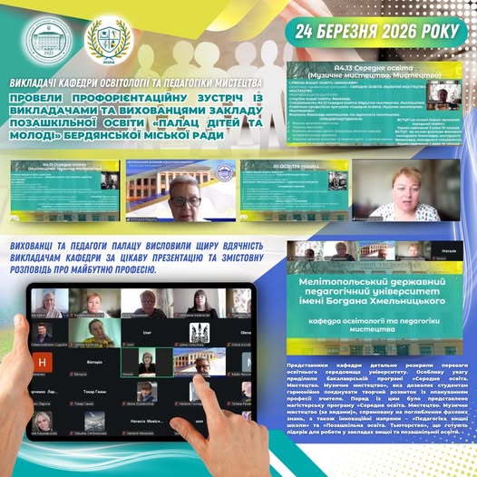 25 березня 2026 року викладачі кафедри освітології та педагогіки мистецтва провели профорієнтаційну зустріч із викладачами та вихованцями закладу позашкільної освіти «Палац дітей та молоді» Бердянської міської ради. Під час заходу майбутніх абітурієнтів поінформували про умови вступу та траєкторії фахової підготовки за мистецько-педагогічним профілем.
