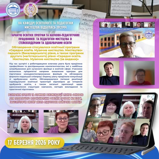 🤝 17 березня 2026 року відбулась зустріч гарантів освітніх програм та науково-педагогічних працівників кафедри освітології та педагогіки мистецтва зі стейкхолдерами та здобувачами освіти. Обговорення стосувалося освітньої програми «Середня освіта. Музичне мистецтво. Мистецтво» першого (бакалаврського) рівня, а також програми другого (магістерського) рівня «Середня освіта. Мистецтво. Музичне мистецтво (за видами)».