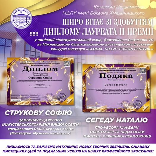 🏛 Колектив МДПУ імені Богдана Хмельницького щиро вітає Струкову Софію, здобувачку другого (магістерського) рівня вищої освіти за спеціальністю 014.13 Середня освіта (Мистецтво. Музичне мистецтво), з участю у Міжнародному багатожанровому дистанційному фестивалі-конкурсі мистецтв «GLOBAL TALENT FUSION FESTIVAL».