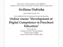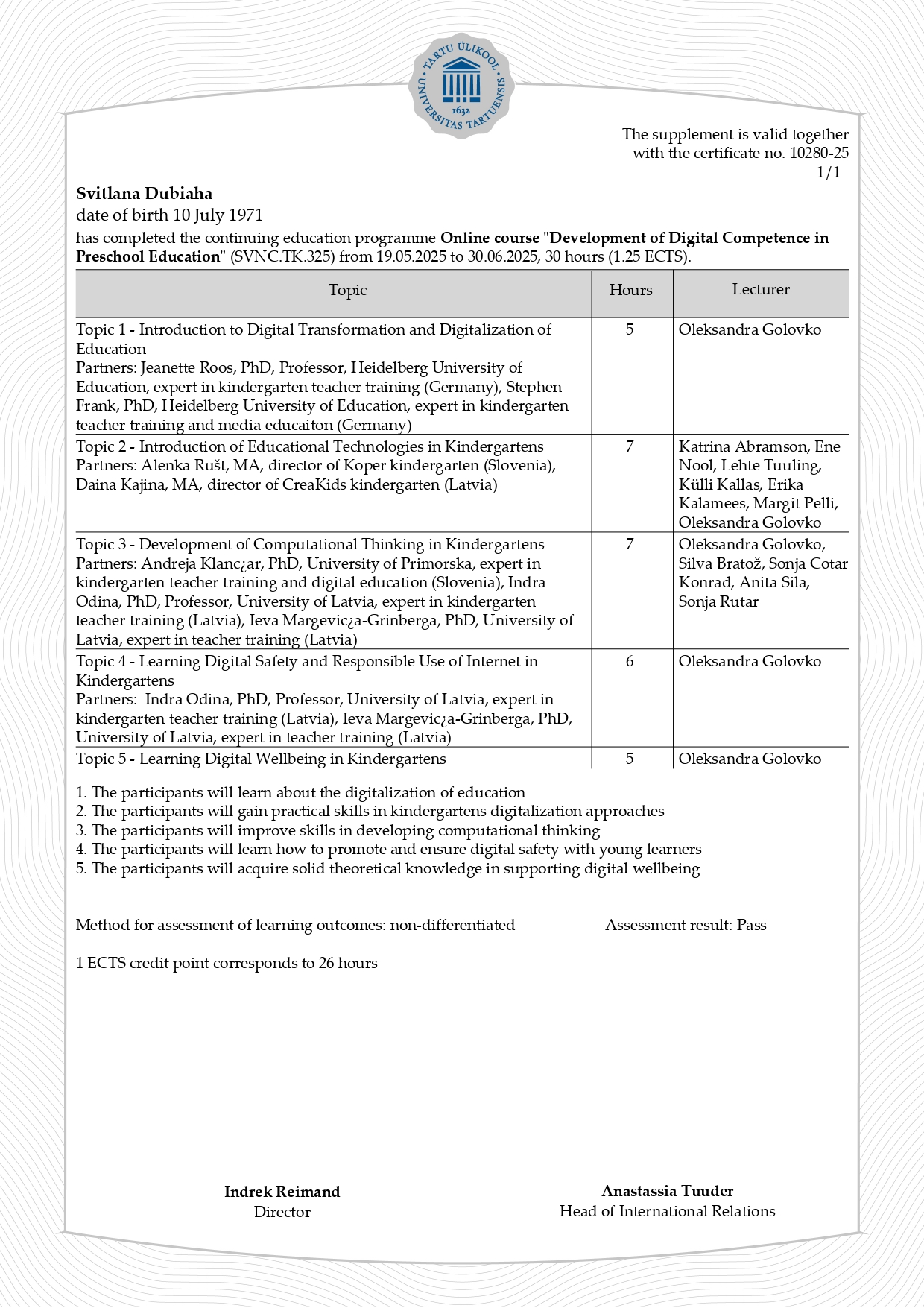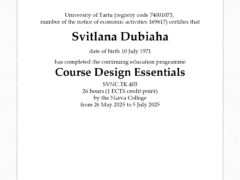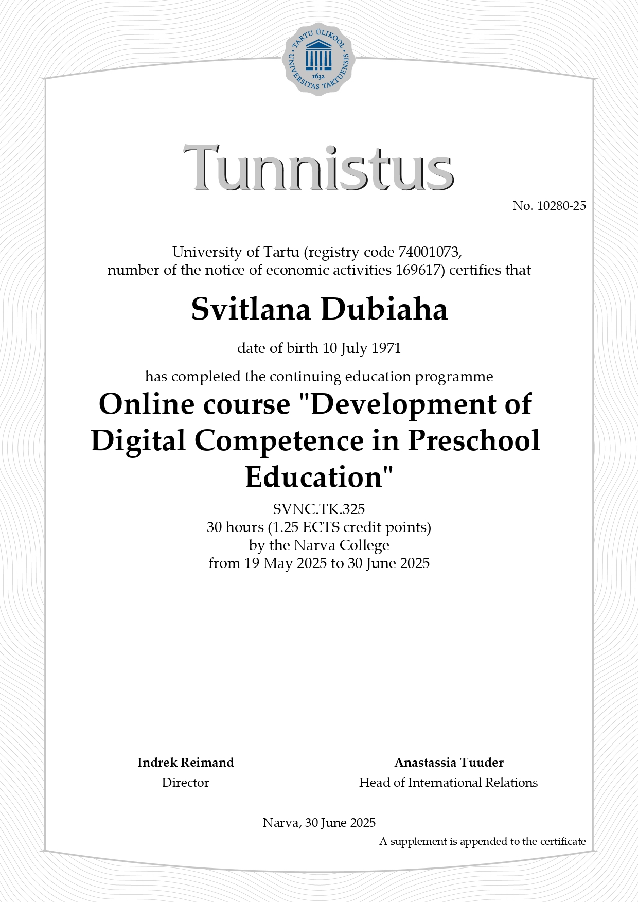 Пройшла навчання за програмою форуму «Навички майбутнього 2024» (15 годин) на базі НУ «Запорізька політехніка», проведеного Національним агенством кваліфікацій. Сертифікат АР №4108/0338-24 від 28 листопада 2024 р.
