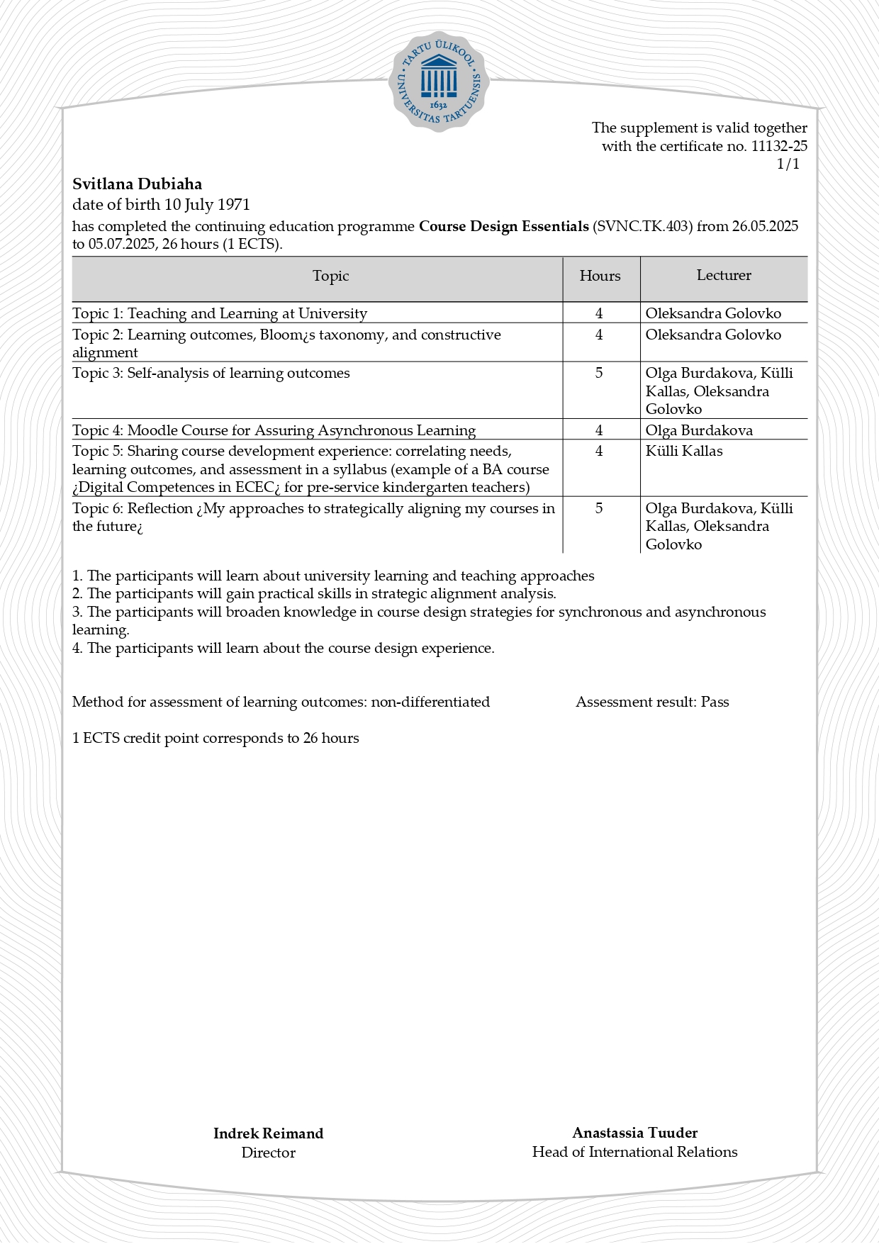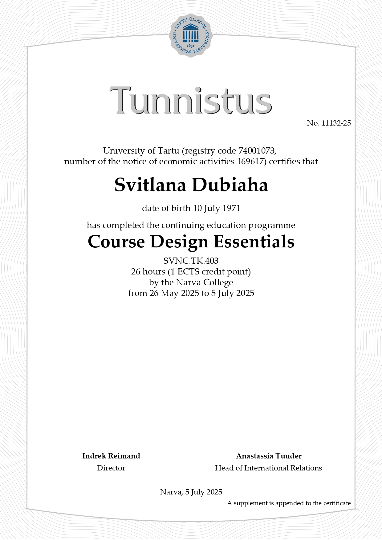 Пройшла навчання за програмою вебінару «Академічна доброчесність: виклики, проблеми та перспективи – 2025» (15 годин) на базі НУ «Запорізька політехніка». Сертифікат АР №4485/0073-25 від 20 березня 2025 р.
