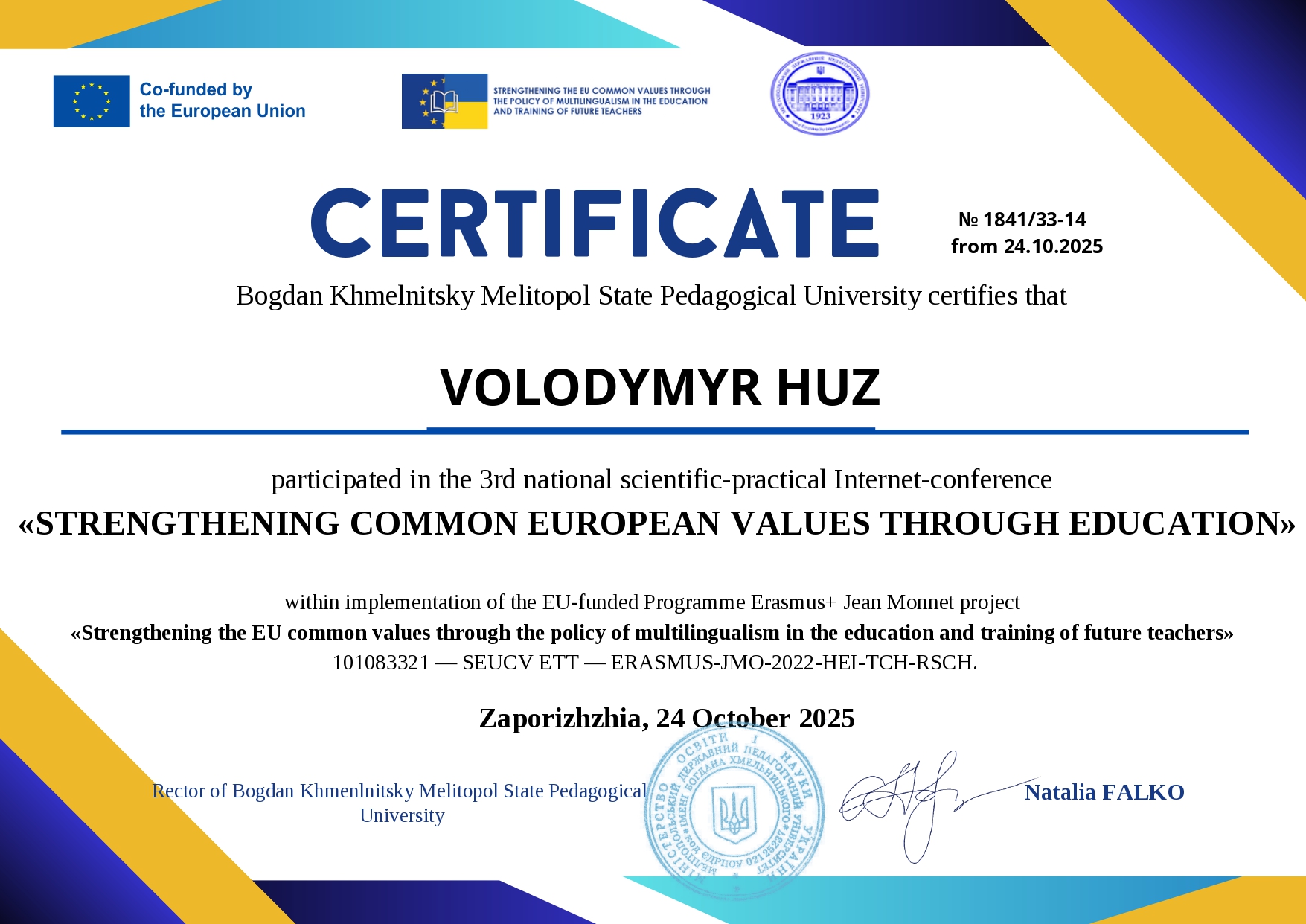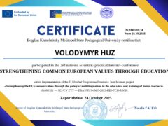 Наукове стажування в Катовіцькій технологічній школі, Польща (180 год.). Тема «Освіта та індивідуалізація в навчальних закладах». З 25.06.2020 по 04.10.2020 р. Сертифікат №59 від 04.10.2020 р.