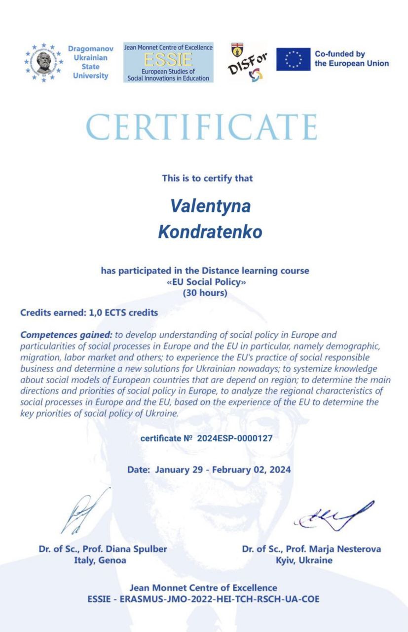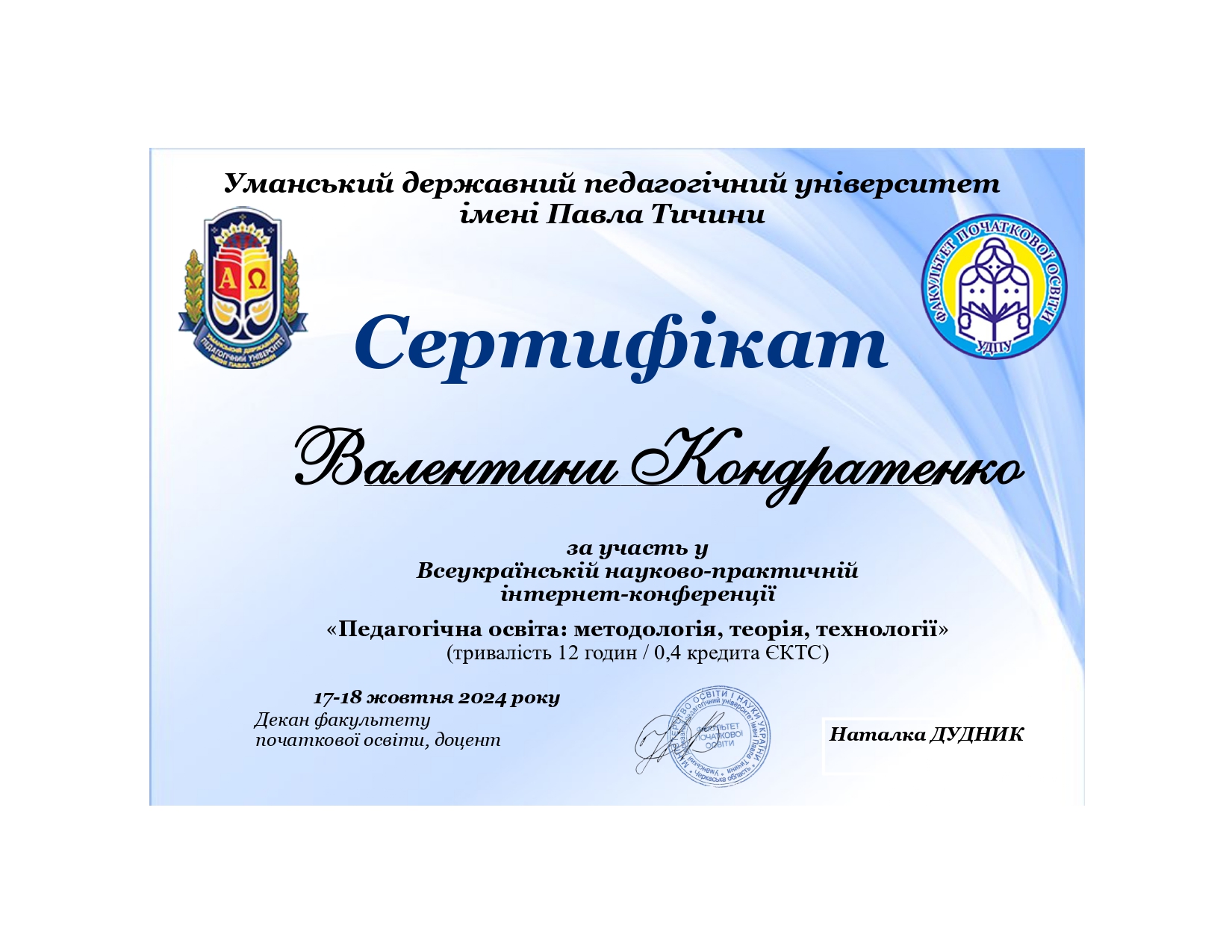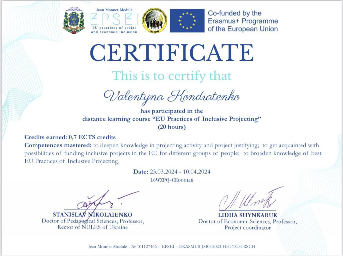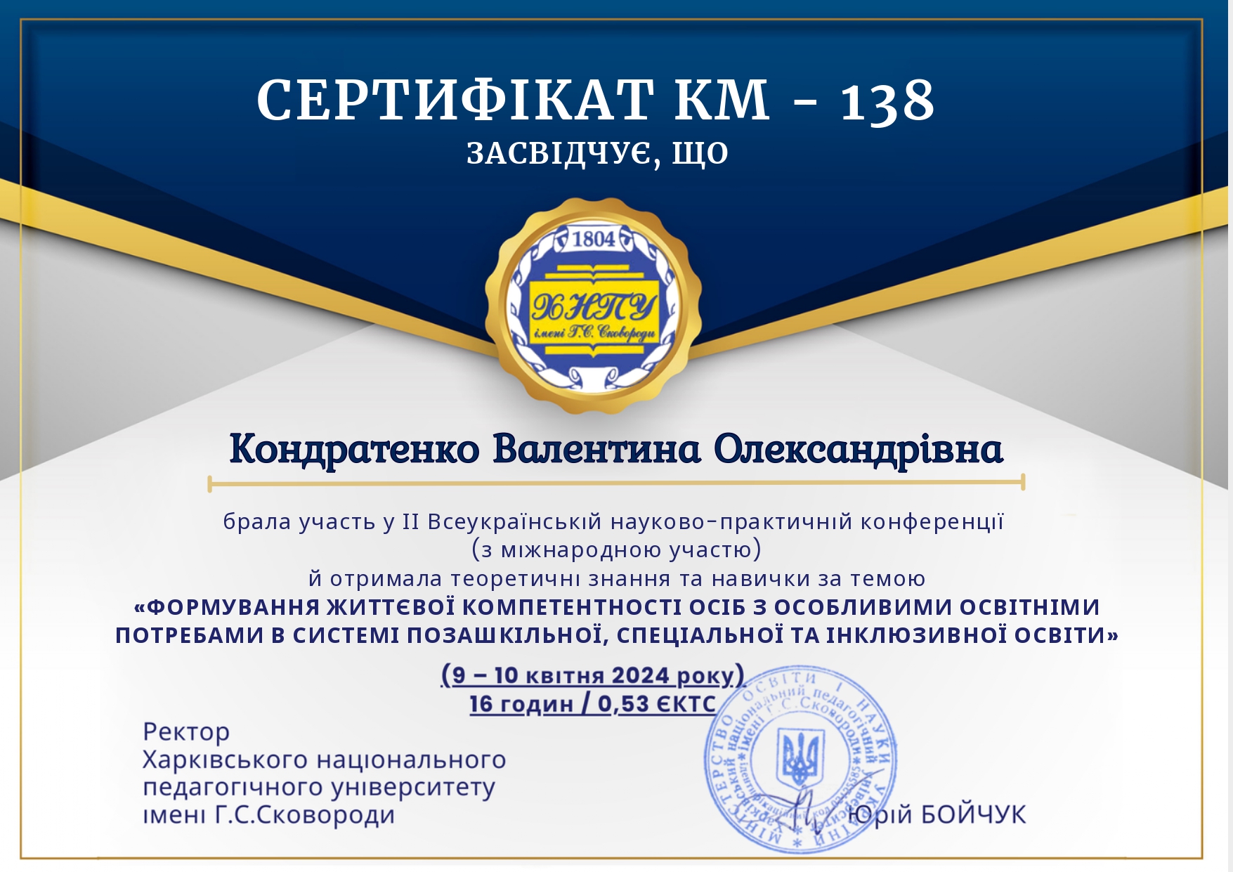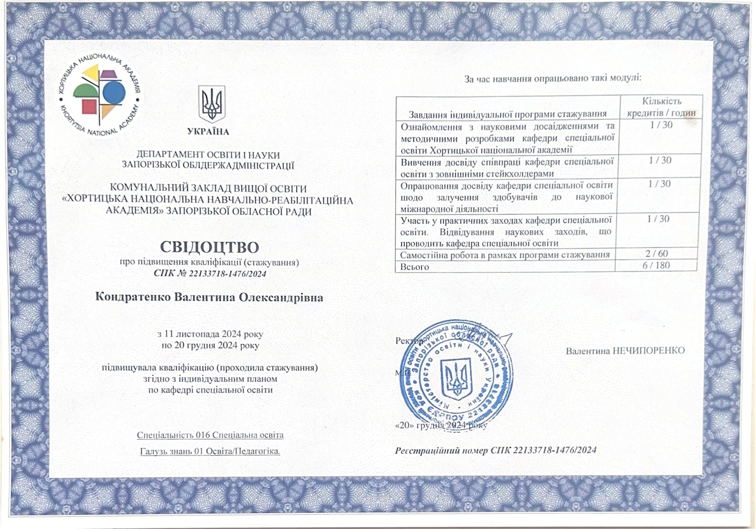 Курси підвищення кваліфікації (стажування) на базі КЗВО “Хортицька національна навчально-реабілітаційна академія” Запорізької обласної ради на кафедрі спеціальної освіти з 11 листопада 2024 року по 20 грудня 2024 року. Свідоцтво СПК №22133718-1476/2024 (6 кредитів/180 год.)