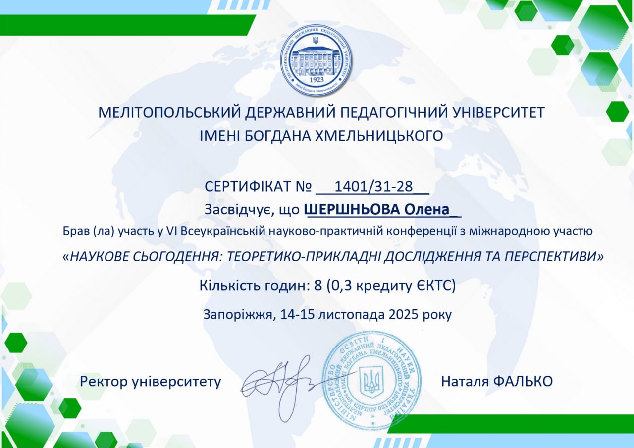 Підвищення кваліфікації педагогічних та науково-педагогічних працівників “Професійний розвиток педагога в умовах освітніх трансформацій” 8-10 липня 2025 року м. Київ (30 годин / 1 кредит ЄКТС) Сертифікат ПК38282994/6085-25 від 10 липня 2025 року.