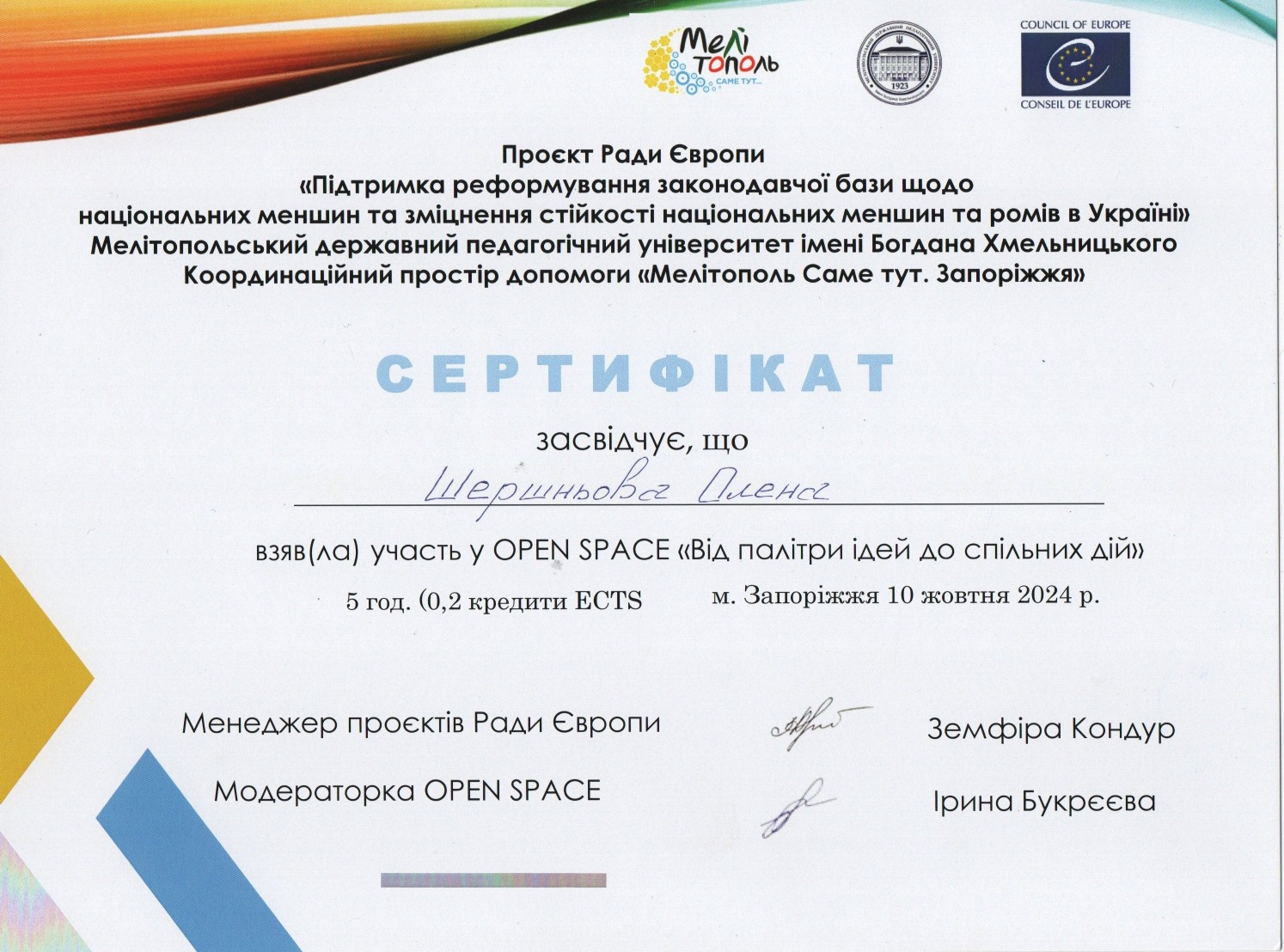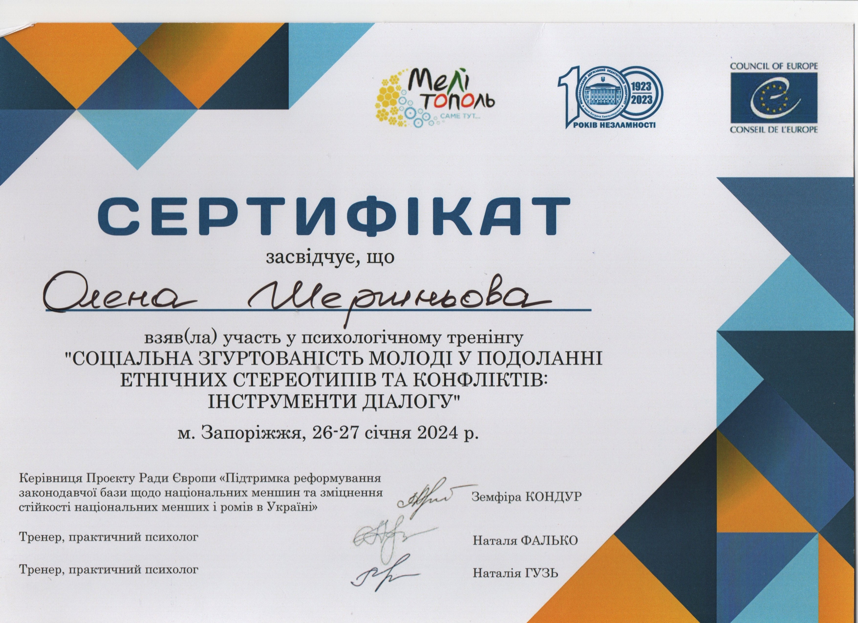 Міжнародна програма стажування в рамках Міжнародної весняної школи «Інклюзія, соціальна відповідальність та підприємництво. Соціальні інновації для розвитку громад та залучення молоді» з 17.03.2025 р. по 18.04.2025 р. (180 годин / 6 кредитів ЄКТС). Сертифікат №2025SPS-000259 від 2025 р.