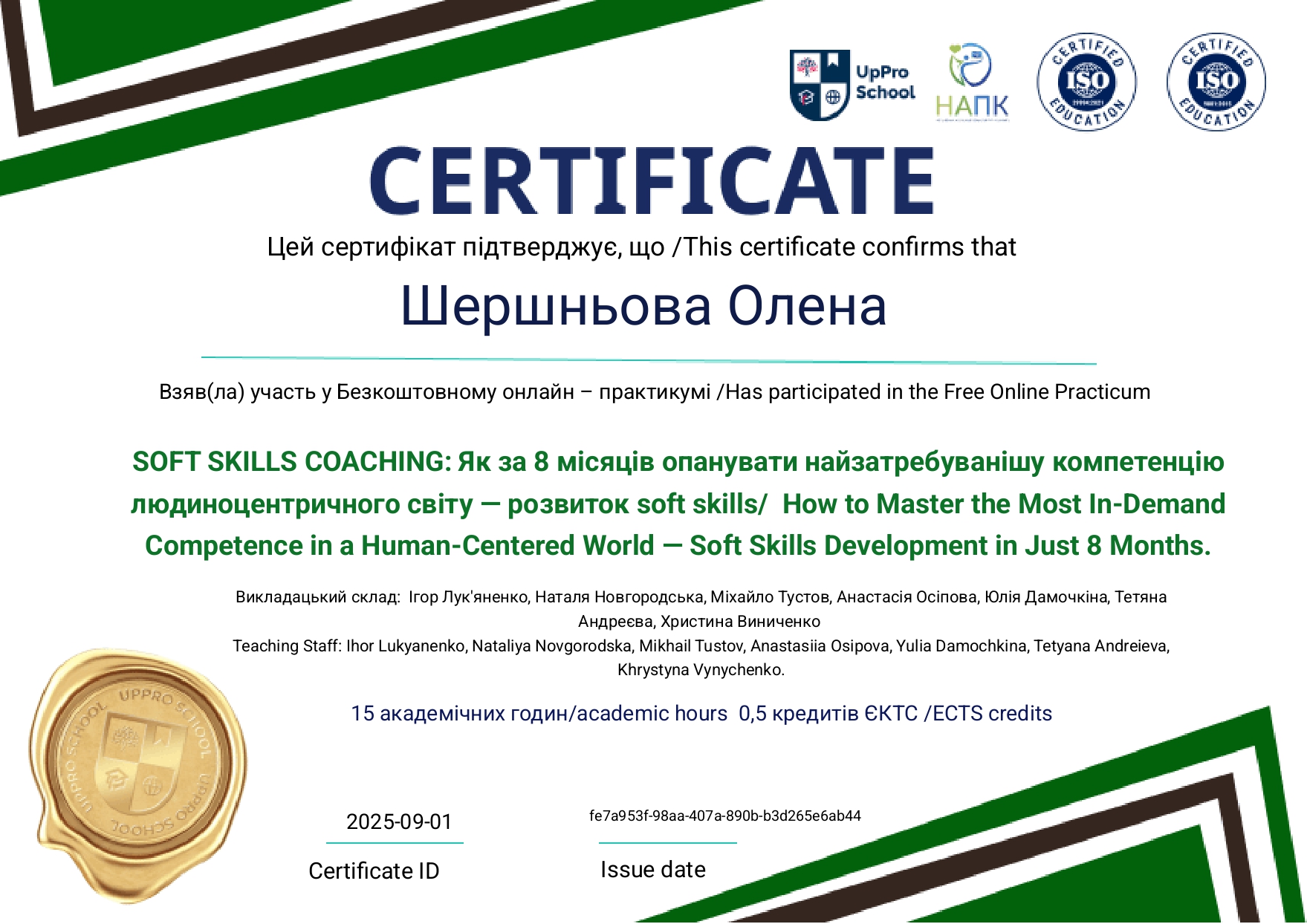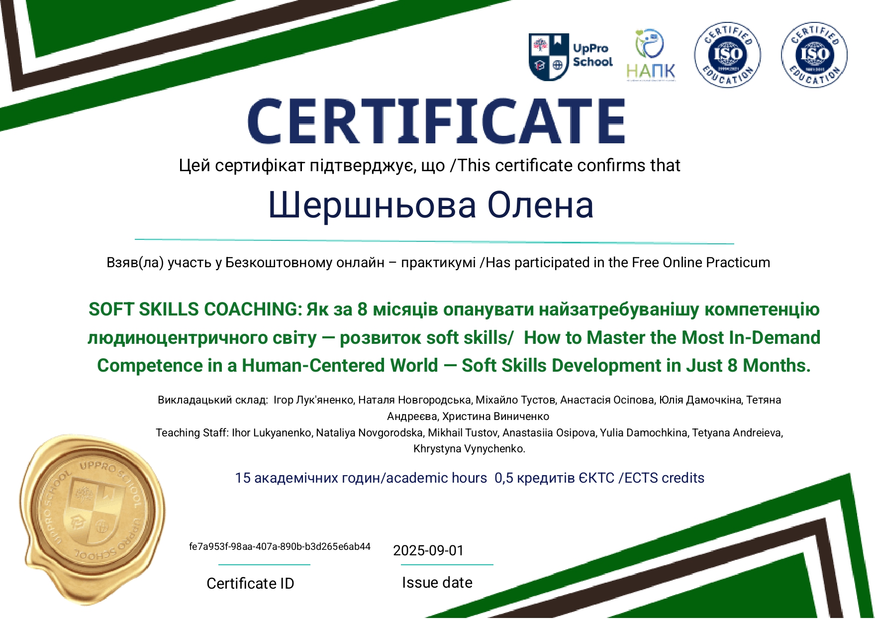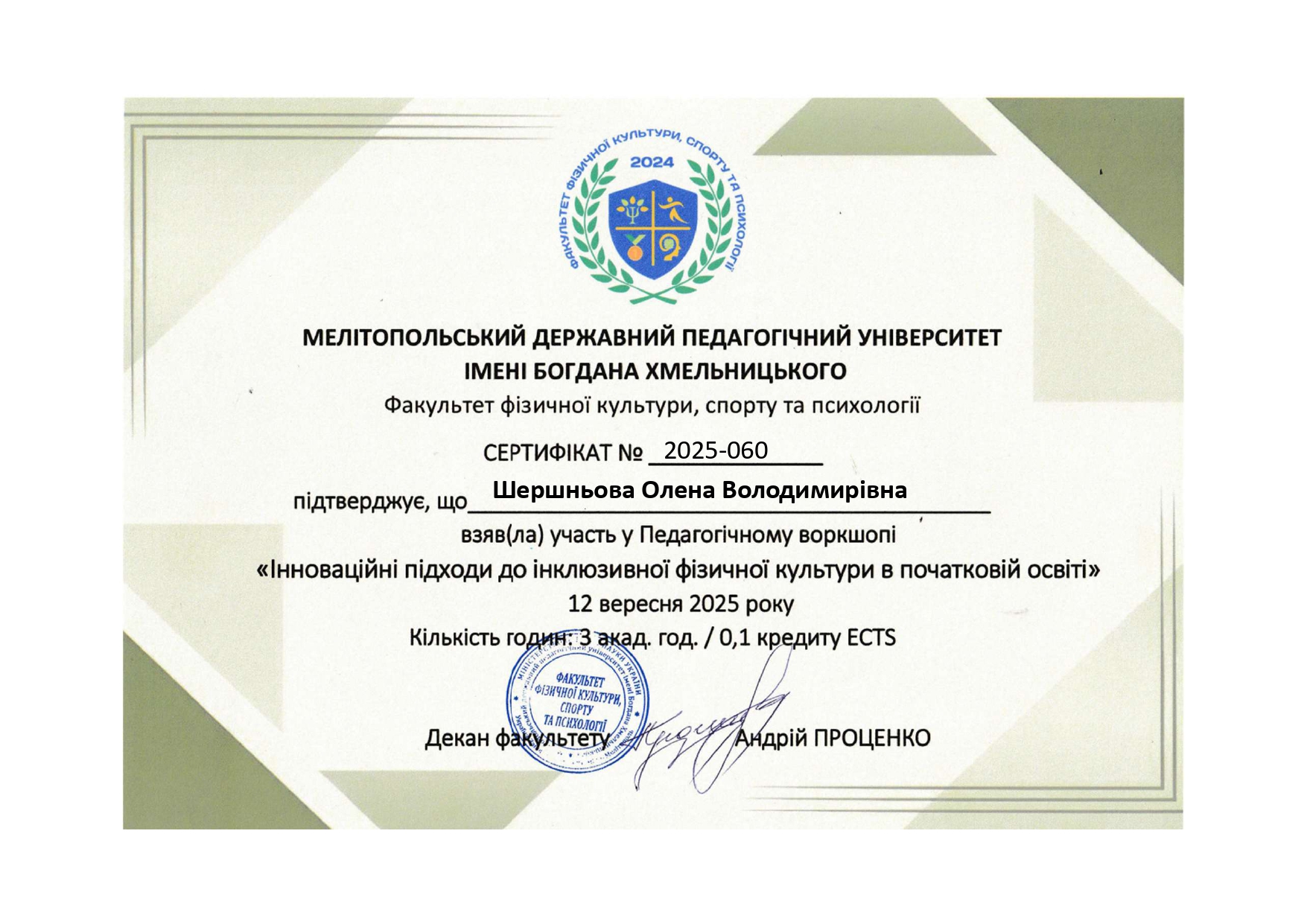 Підвищення кваліфікації педагогічних та науково-педагогічних працівників “Професійний розвиток педагога в умовах освітніх трансформацій” 8-10 липня 2025 року м. Київ (30 годин / 1 кредит ЄКТС) Сертифікат ПК38282994/6085-25 від 10 липня 2025 року.