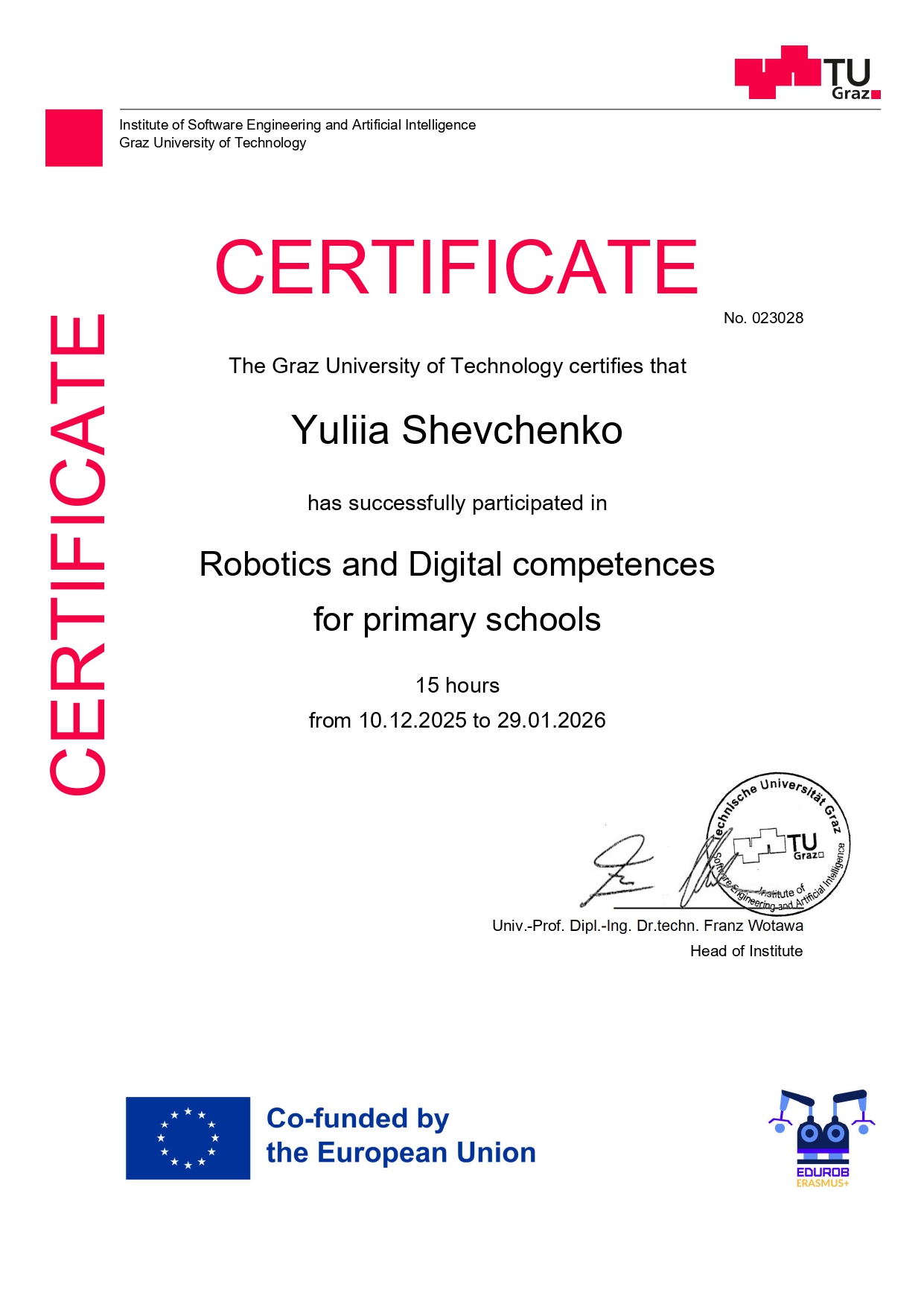 Підвищення кваліфікації у ІІ Міжнародній осінній школі «СОЦІАЛЬНІ ВИМІРИ ЄВРОПЕЙСЬКИХ СТУДІЙ» Генуя (Італія) – Київ (Україна), 30 жовтня – листопада 2023 року. Сертифікат №2023_AS-000275 від 14.11.2023 р. (180 год.)