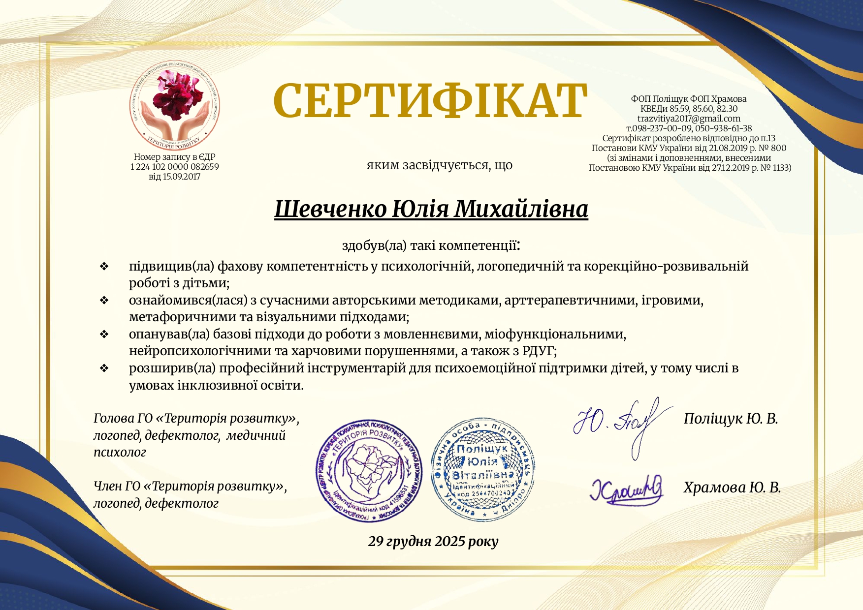 VІІ Регіональна науково-практична конференція «Оновлення моделі інтегральних компетентностей в контексті досягнення цілей сталого розвитку» (сертифікат № 0077/в-2025, 8 год/0,3 кредити ЄКТС);