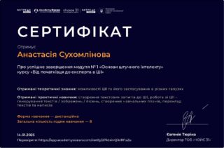Мелітопольський державний педагогічний університет імені Богдана Хмельницького (рік випуску – 2023 р. Спеціальність “Початкова освіта”; освітня кваліфікація “Вчитель початкових класів закладу загальної середньої освіти. Організатор початкової освіти. Вчитель інклюзивного класу”).