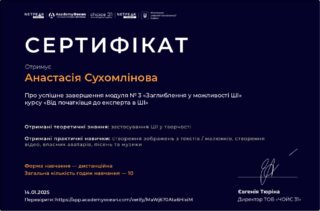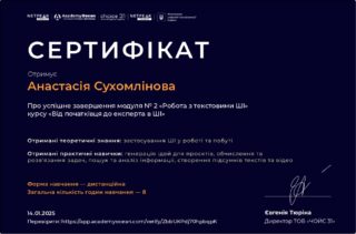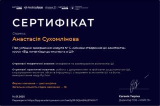 Мелітопольський державний педагогічний університет імені Богдана Хмельницького (рік випуску – 2023 р. Спеціальність “Психологія”; освітня кваліфікація “Магістр психології”).
