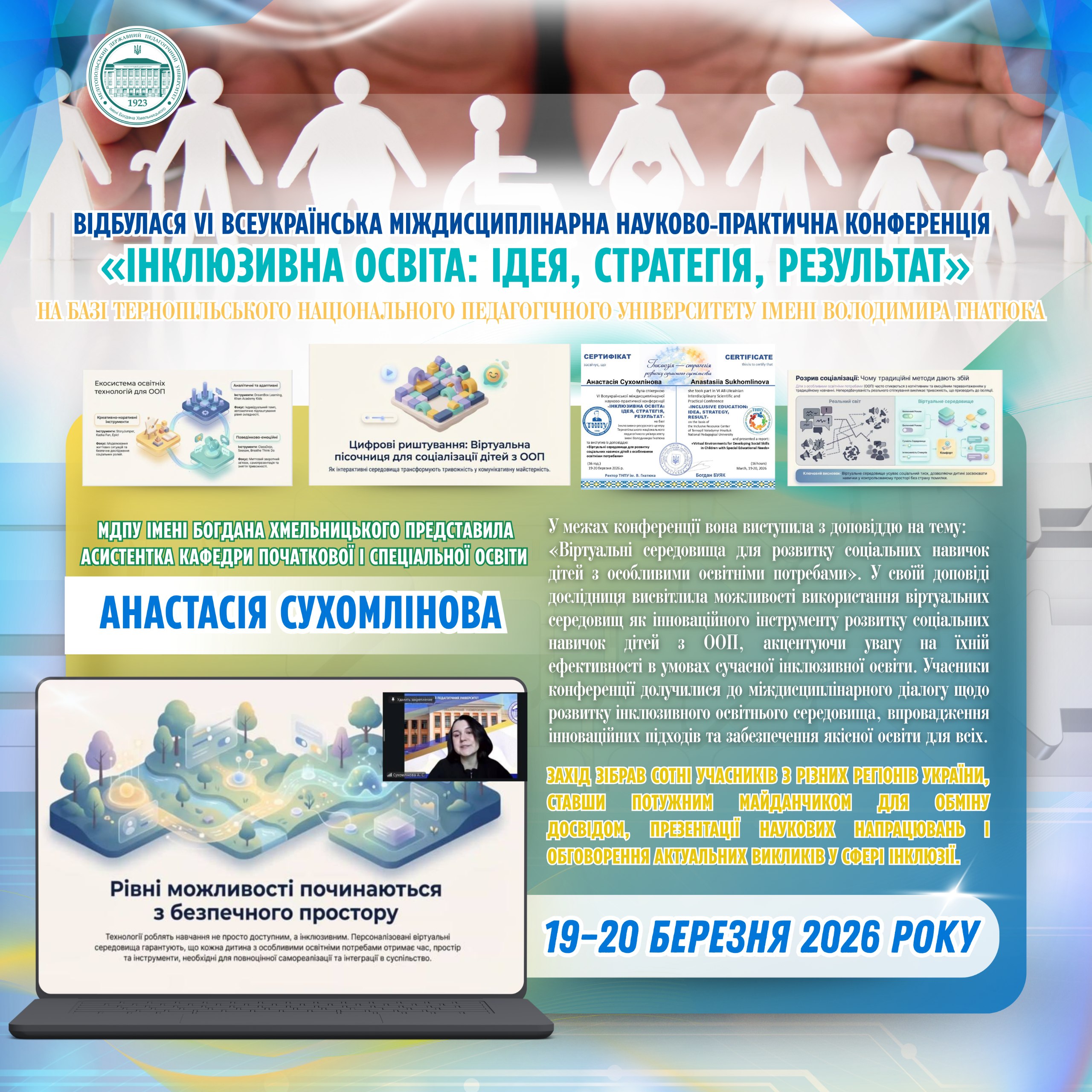 19–20 березня 2026 року на базі Тернопільського національного педагогічного університету імені Володимира Гнатюка відбулася VІ Всеукраїнська міждисциплінарна науково-практична конференція «Інклюзивна освіта: ідея, стратегія, результат», яка об’єднала науковців і практиків з усієї України.