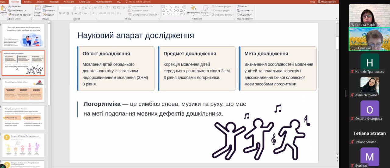 До обговорення долучилися викладачі кафедри та наукові керівники (доктор педагогічних наук, професор Шевченко Ю.М., кандидат педагогічних наук, доцент Кондратенко В.О., доктор філософії, старший викладач Свириденко Г.В.). Здобувачі презентували результати власних досліджень, акцентуючи на їх практичній цінності та можливостях застосування у сфері логопедичної підтримки дітей з особливими освітніми потребами. Доповіді супроводжувалися змістовними презентаціями, що допомогло продемонструвати ключові висновки та авторські методичні розробки.