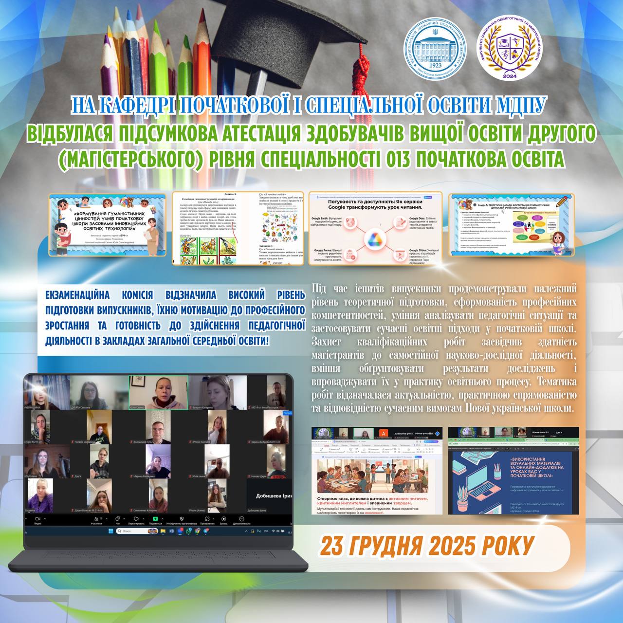 23 грудня 2025 року на кафедрі початкової і спеціальної освіти відбулася підсумкова атестація здобувачів вищої освіти другого (магістерського) рівня денної форми навчання за спеціальністю 013 Початкова освіта.