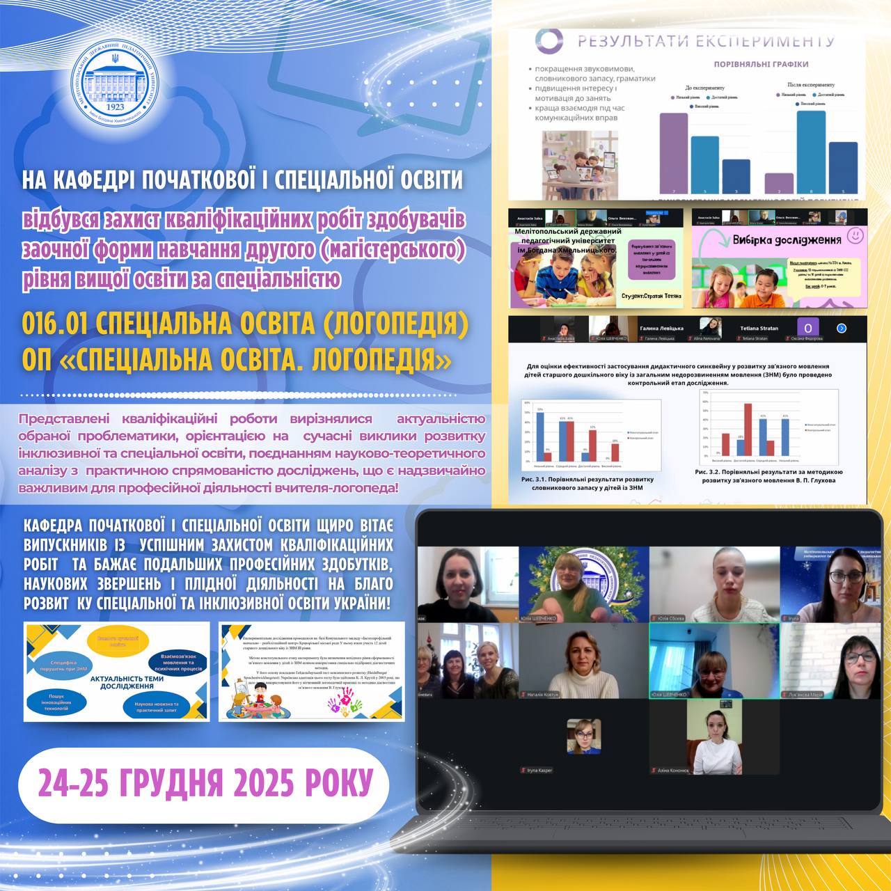 📅📚 24–25 грудня 2025 року на кафедрі початкової і спеціальної освіти Мелітопольський державний педагогічний університет імені Богдана Хмельницького відбувся захист кваліфікаційних робіт здобувачів заочної форми навчання другого (магістерського) рівня вищої освіти групи СОЛ24М за спеціальністю 016.01 Спеціальна освіта (Логопедія), освітньо-професійною програмою «Спеціальна освіта. Логопедія».
