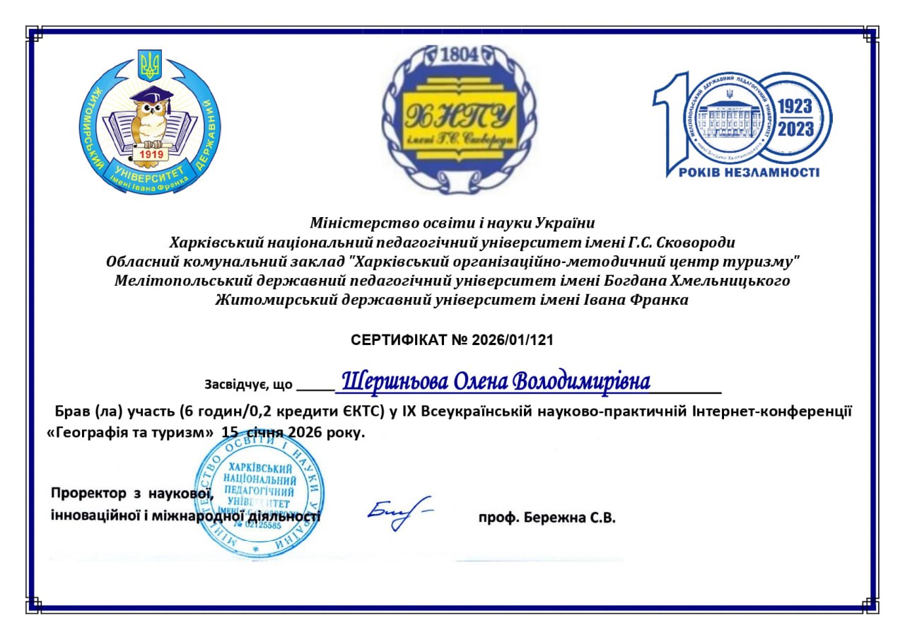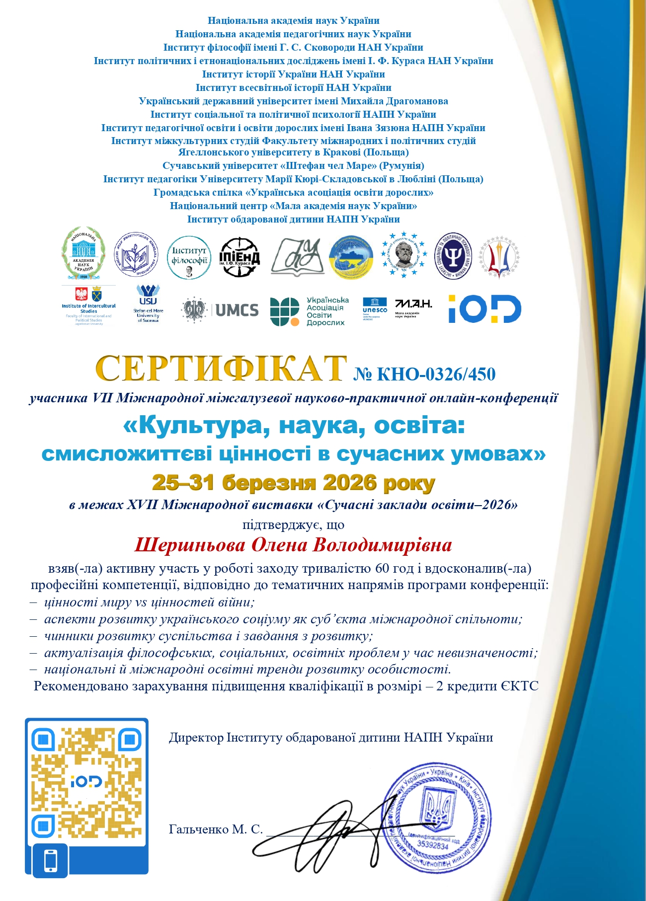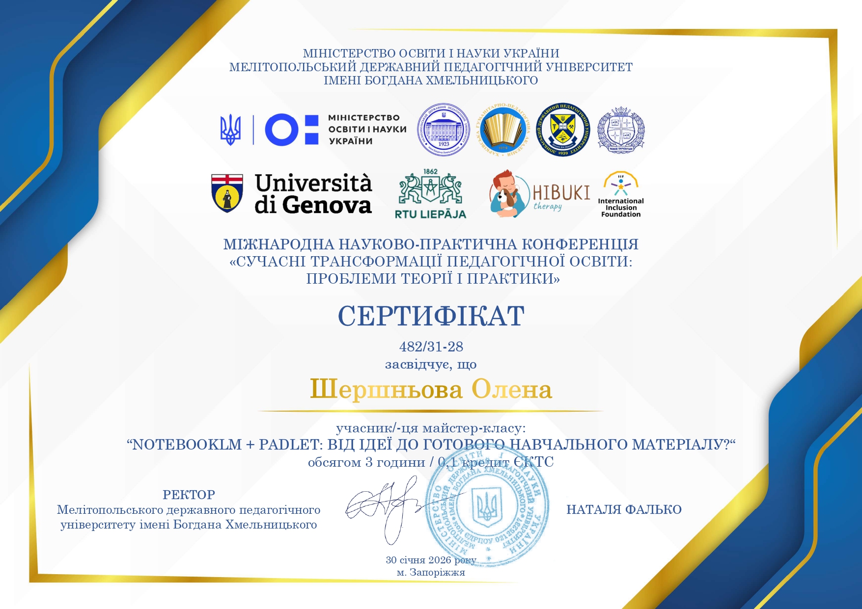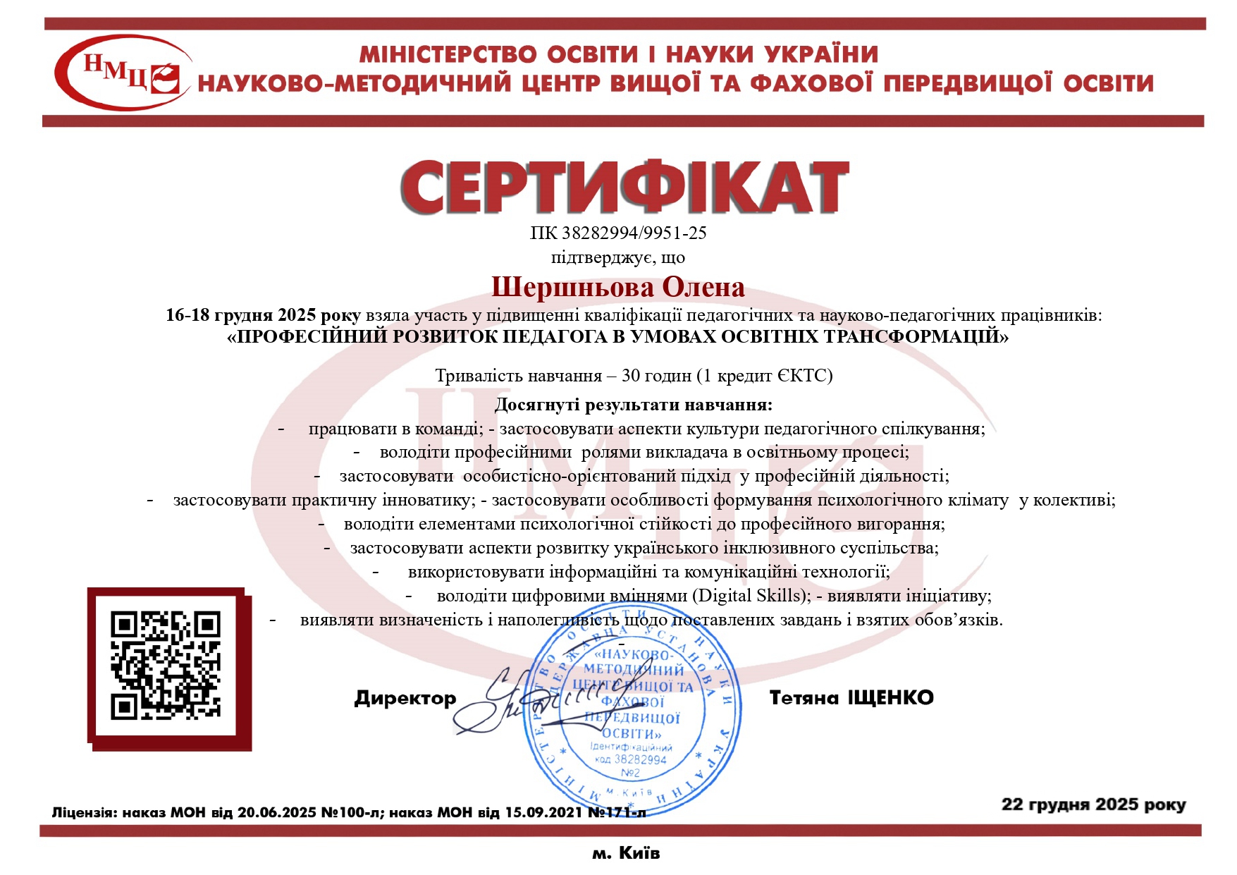 Підвищення кваліфікації педагогічних та науково-педагогічних працівників “Професійний розвиток педагога в умовах освітніх трансформацій” 8-10 липня 2025 року м. Київ (30 годин / 1 кредит ЄКТС) Сертифікат ПК38282994/6085-25 від 10 липня 2025 року.