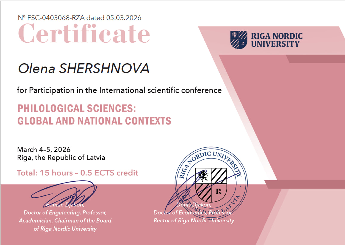 Підвищення кваліфікації «проєкт Еразмус+ у сфері освіти: від формування заявки до успішного звітування» на базі Сумського державного університету з 10.02.2025 р. до 14.02.2025р. Свідоцтво СП №05408289/0393-25, 1 кредит ЄКТС (30 год.).