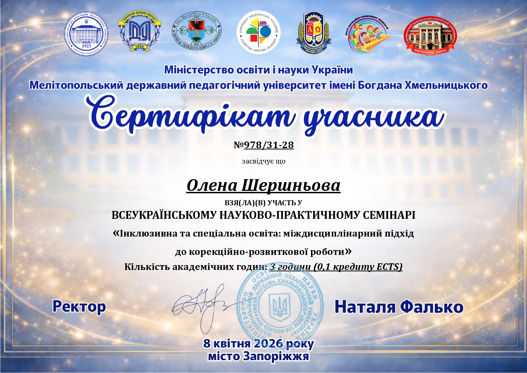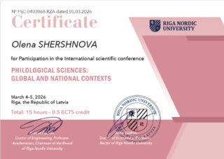 Міжнародна програма стажування в рамках Міжнародної весняної школи «Інклюзія, соціальна відповідальність та підприємництво. Соціальні інновації для розвитку громад та залучення молоді» з 17.03.2025 р. по 18.04.2025 р. (180 годин / 6 кредитів ЄКТС).  Сертифікат №2025SPS-000259 від 2025 р.