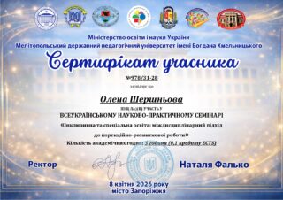 Підвищення кваліфікації (стажування) в КЗВО “Хортицька національна навчально-реабілітаційна академія” Запорізької обласної ради з 13.02.2025 по 28.03.2025, 6 кредитів ЄКТС (180 годин) на кафедрі спеціальної освіти факультету спеціальної освіти та соціально-гуманітарних наук. Свідоцтво СПК №22133718-1492/2025 від 28 березня 2025 року.